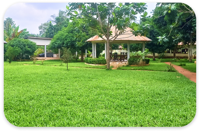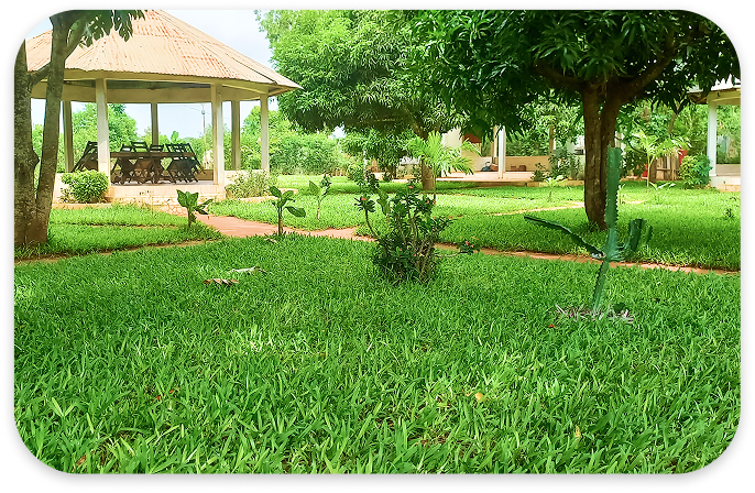 Envie de se retirer loin du bruit et de tout stress, notre espace vert de détente vous accueille sur une superficie de plus de 5.000 mètres carrés, couvert de palmeraies, cocotiers, manguiers, bananiers, et plusieurs autres variétés d’arbres.